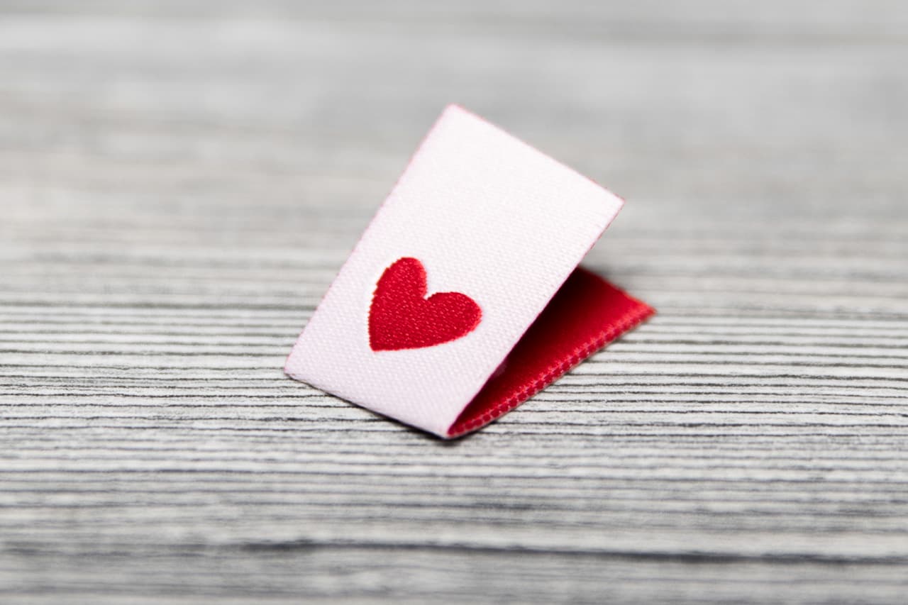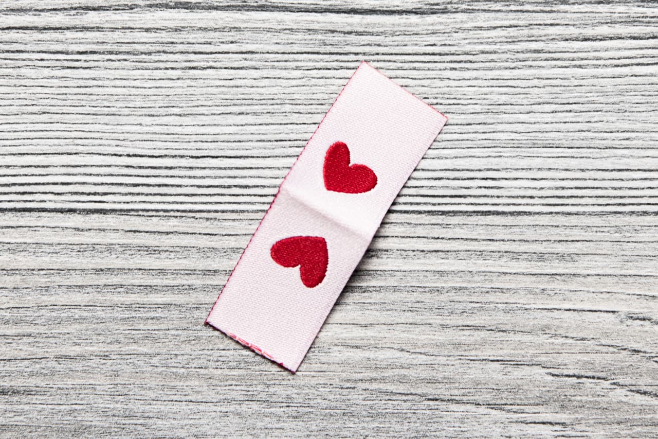 Dein Label kommt einzeln verpackt zu dir. Mit der hochwertigen Webstruktur, des leuchtend roten Herzens und der Mittelfaltung ist es vielseitig einsetzbar.